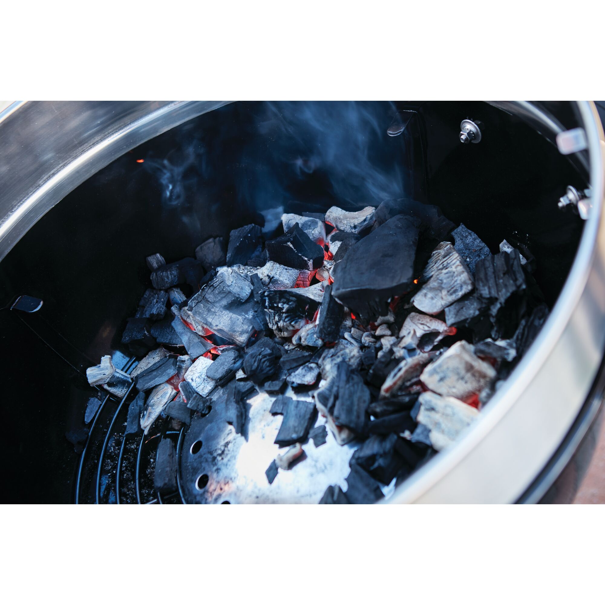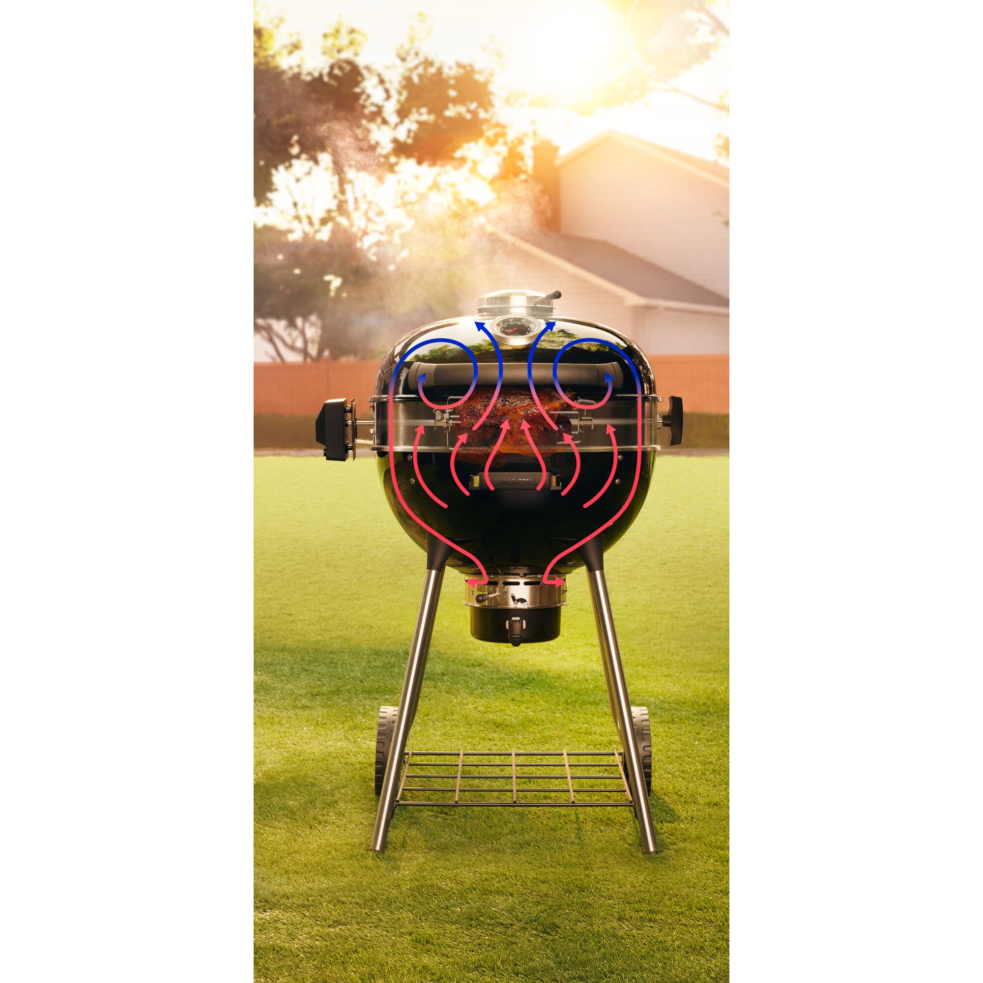 Ce modèle se distingue par ses grilles de cuisson en fonte émaillée réglables sur trois hauteurs, vous permettant d’ajuster la distance par rapport à la source de chaleur selon vos besoins de cuisson. Grâce au système Vortex Heat Management, la convection à l’intérieur du gril est améliorée, offrant une répartition plus uniforme de la chaleur pour une saisie parfaite et une meilleure efficacité du charbon.