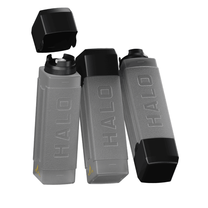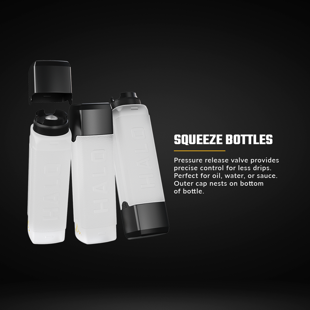 Les bouteilles compressibles Elite de Halo comprennent une valve empêchant l’écoulement. Chaque bouteille vous offre une capacité de 800 ml. Le couvercle s’installe aussi sur la base, vous ne le perdrez plus jamais! Excellent pour les huiles l’eau et même pour les vinaigrettes.