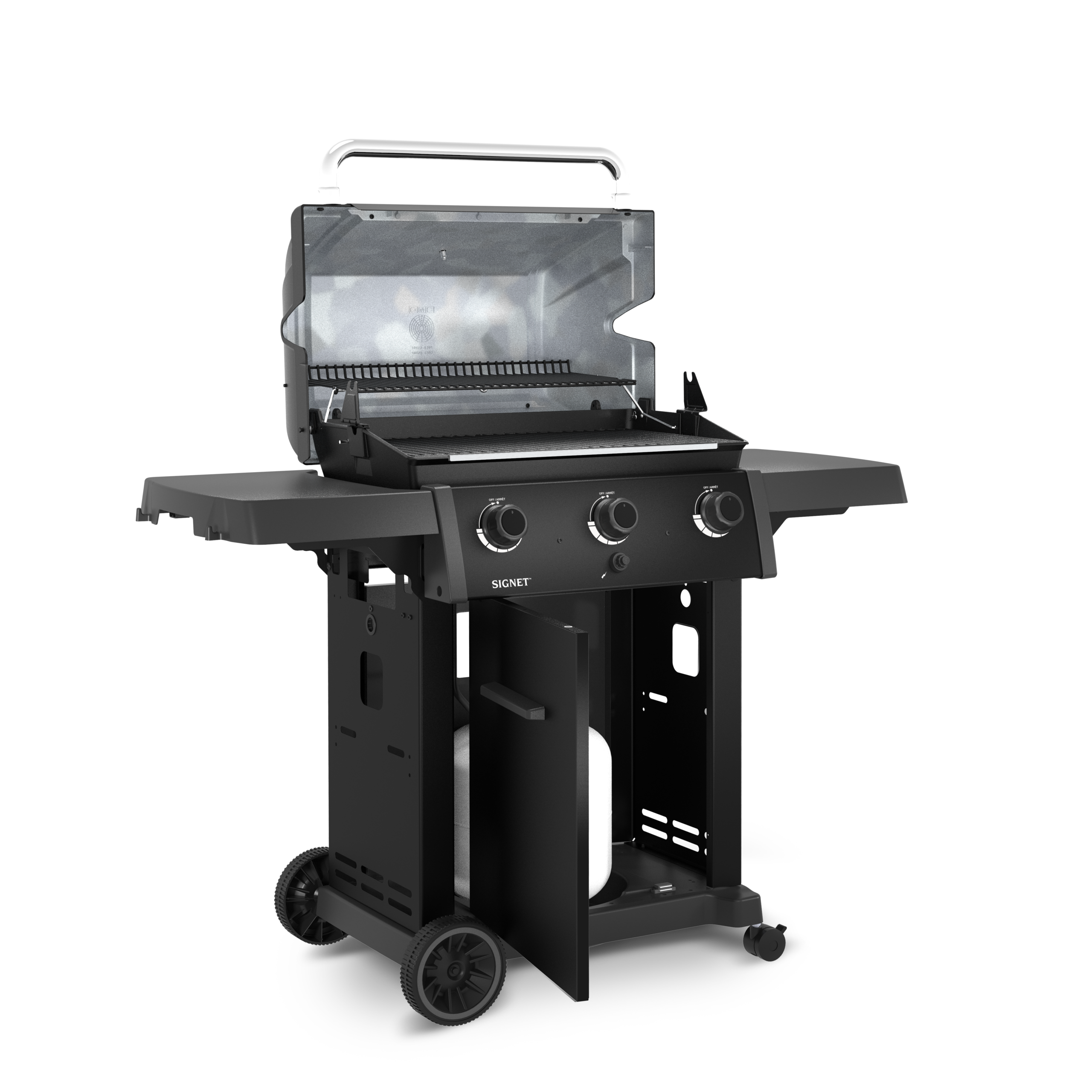 Le Signet 320 est également doté d’un chariot stable avec des tablettes latérales pratiques pour faciliter la préparation des aliments et garder vos ustensiles à portée de main. Son système de gestion des graisses améliore la facilité d’entretien et contribue à garder votre barbecue propre plus longtemps.