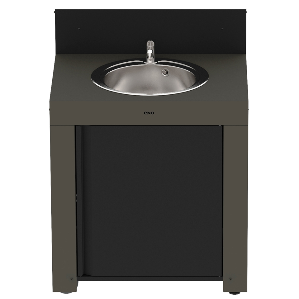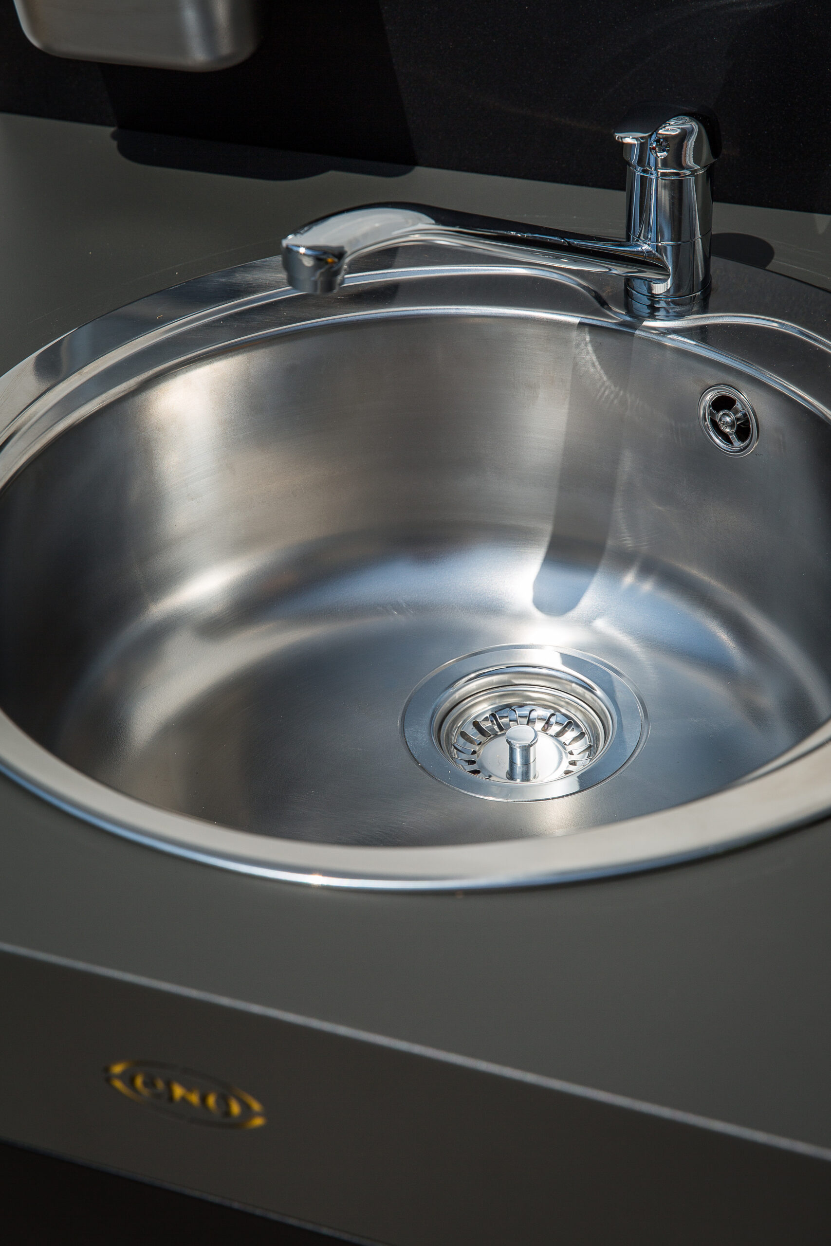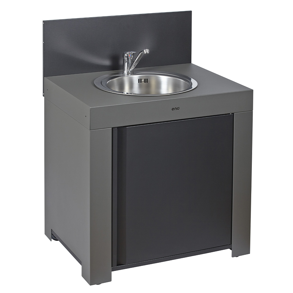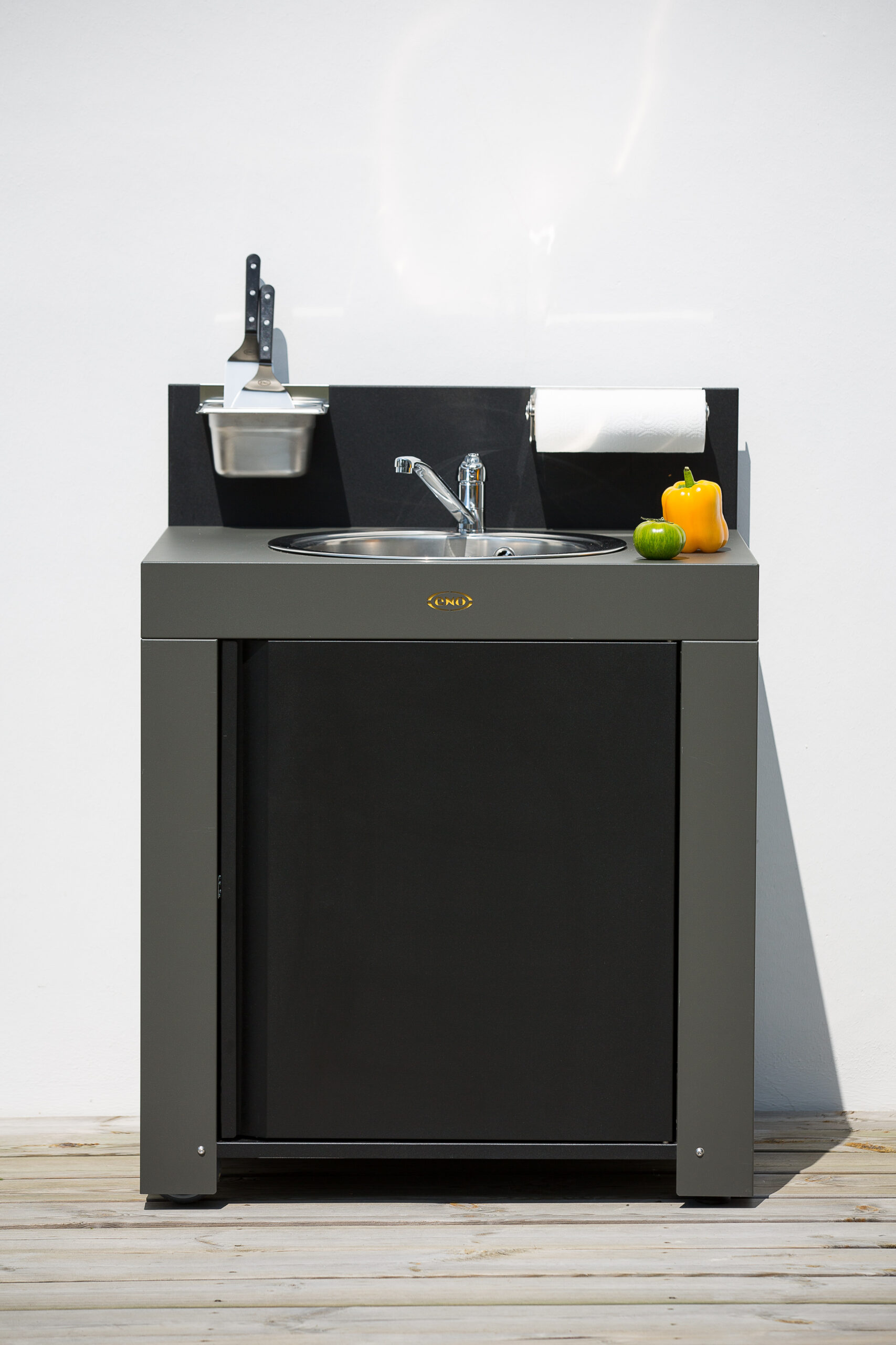Structure et plateau en acier galvanisé Gris cargo – Crédence noire – Porte et fonds en acier galvanisé noir – évier inox avec bonde et siphon – Mitigeur prêt à brancher.