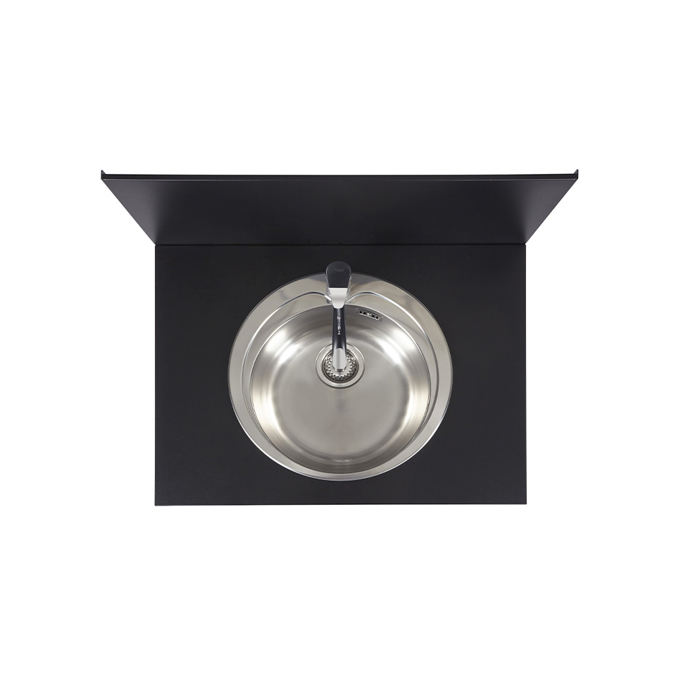 Structure en inox – Plateau en acier galvanisé noir – Crédence noire – Porte noire – Fonds en acier galvanisé noir – évier en inox avec bonde et siphon – Mitigeur à connexion rapide.