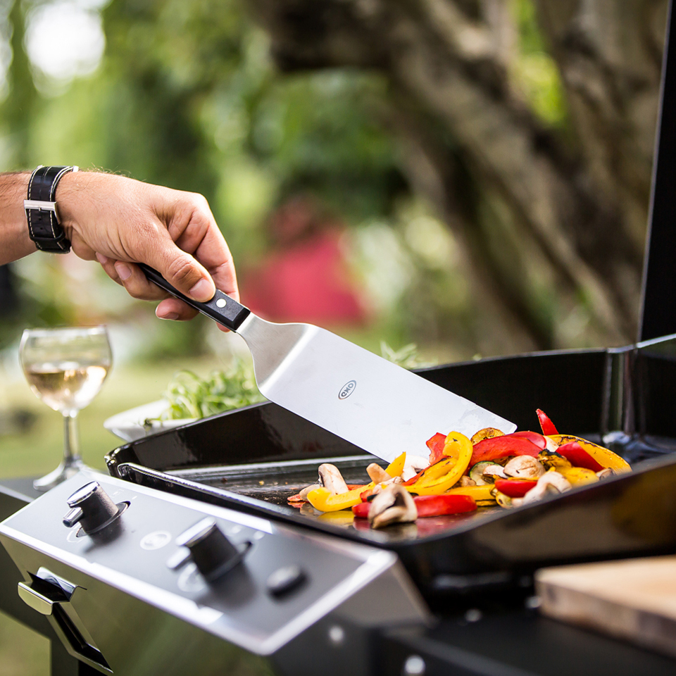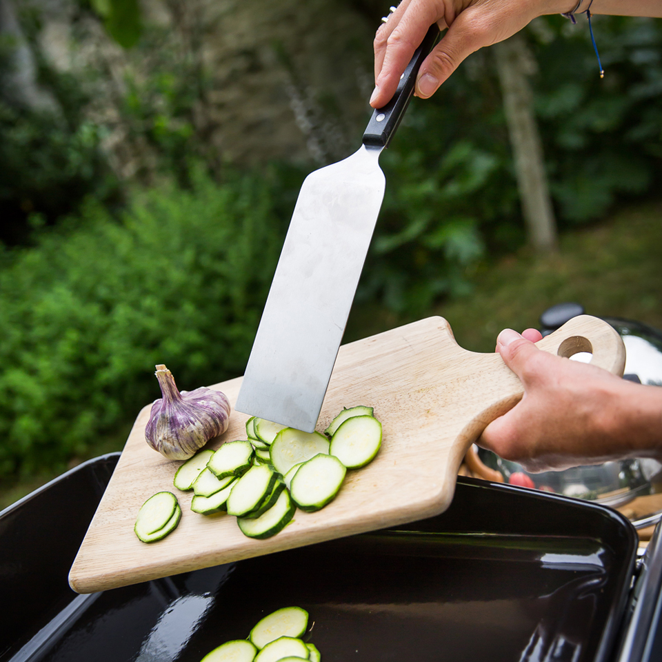 Palette coudée longue – Equilibrée pour empêcher le manche de basculer – Lame flexible avec mémoire de forme – Tranche biseautée.
