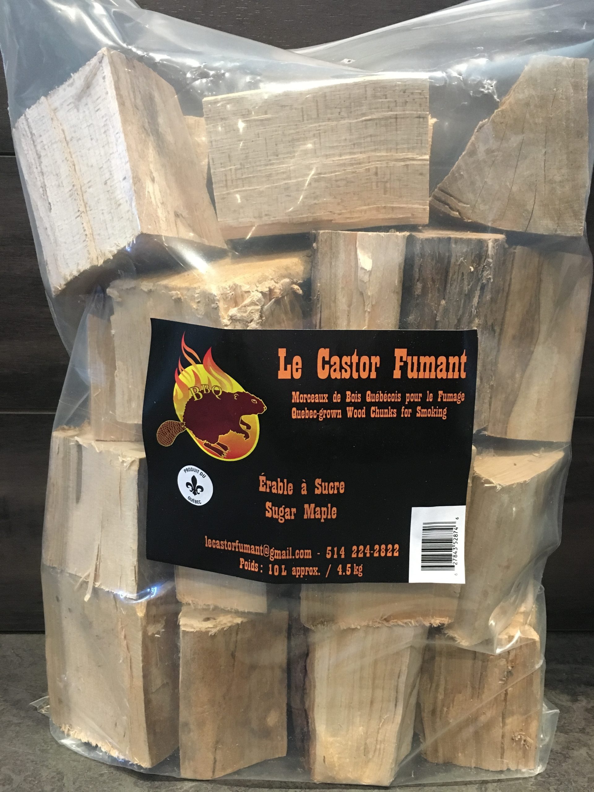 Sac de tronçons de bois d’érable à sucre québécois pour le fumage du Castor Fumant. Entreprise québécoise.