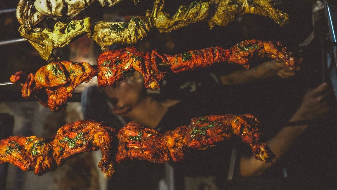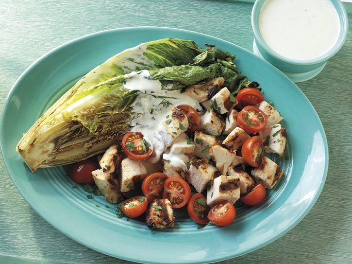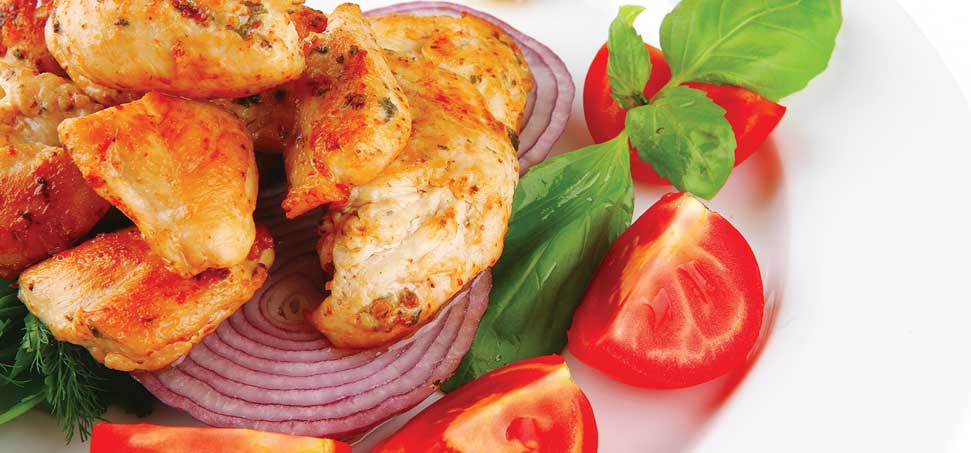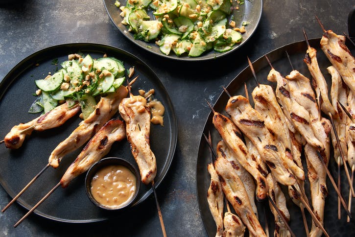 Brochettes de poulet et salade de concombre et de tomates au harissa
